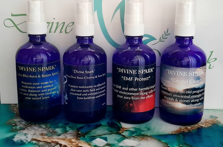 All natural aura sprays for energetic clearing and protection. Available both in my shop or therapy room.